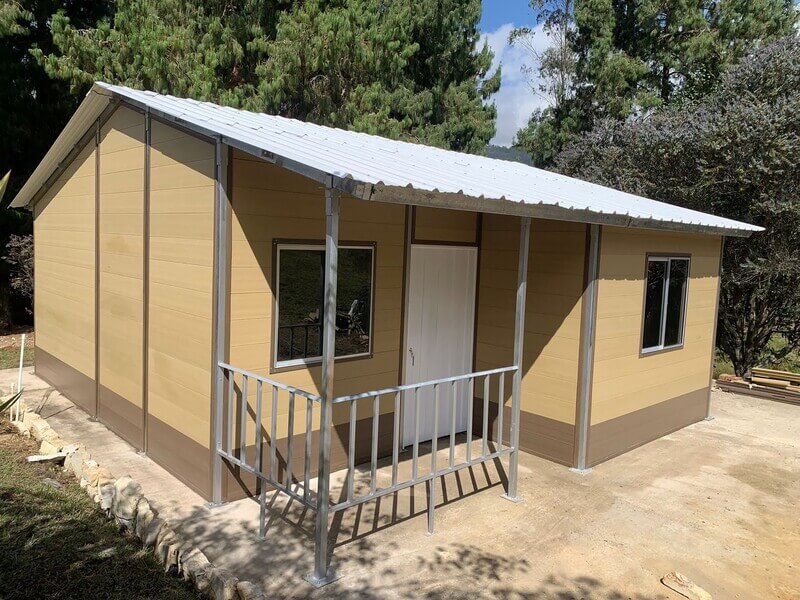 Casa kit fabricada con materiales compuestos de fibras vegetales y polímero. Alta duración, no combustible, fácil de ensamblar con el mínimo de herramientas y sin mano de obra calificada.